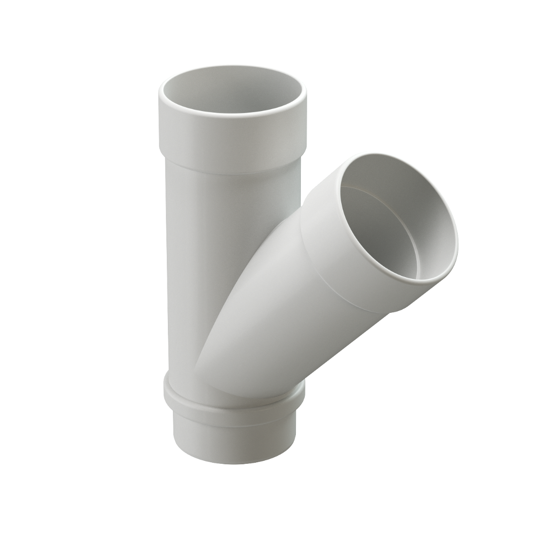 Тройник водосточной трубы нужен, чтобы соединять две трубы диаметром 100 мм, протянутых от рядом расположенных воронок желобов, в один водослив. Одна труба вставляется вертикально, вторая под углом 45 градусов.