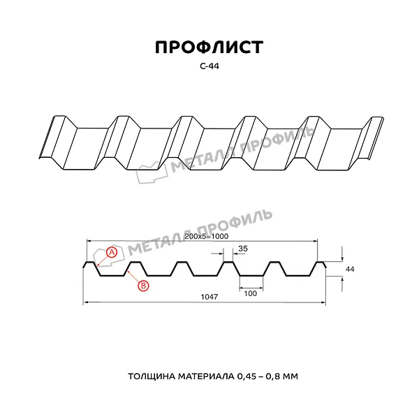 Профлист МЕТАЛЛ ПРОФИЛЬ С-44х1000-A (ПЭ_Д-01-8017-0,45) часто используется в Нижнем Новгороде для обустройства профилированного листа. Представляет собой лист оцинкованной стали с покрытием. Толщина металла с оцинковкой и полимерным покрытием — 0.45 мм.После проката на специальном оборудовании металл принимает волнообразный вид. Такая конфигурация придает профилю жёсткость.