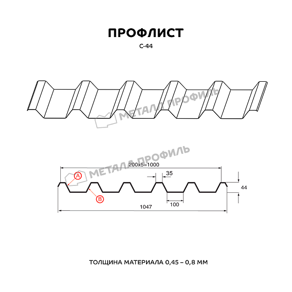 Профилированный лист С-44 применяется практически во всех сферах строительства. Он одинаково пользуется спросом как в гражданском секторе, так и на индустриальных стройках. Профилированный лист с глубиной волны 44 мм характеризуется довольно хорошими несущими способностями. Это наиболее рельефный из профилей с маркировкой С – «стеновой». С-44 пригодится, если вам необходимо: перекрыть кровлю, соорудить подсобные помещения, поставить ограждения, возвести стены и перегородки в щитовых постройках. Также С-44 характеризуется повышенной несущей способностью для возведения каркасов различных сооружений и несъёмной опалубки для бетонирования. Профлист С-44 разрешено устанавливать в областях с суровым климатом. Стороны этого профиля несимметричны. Верхняя часть (А) имеет более динамичный рисунок из узких вершин и используется для кровли. Сторона В выглядит более монолитно, подходит для прочих сфер применения.Покрытие Полиэстер: